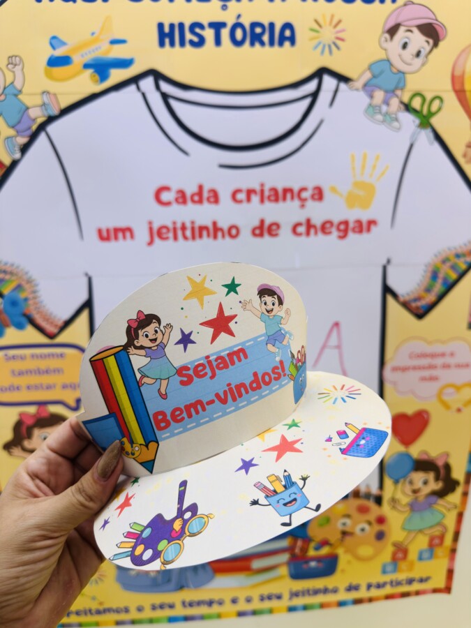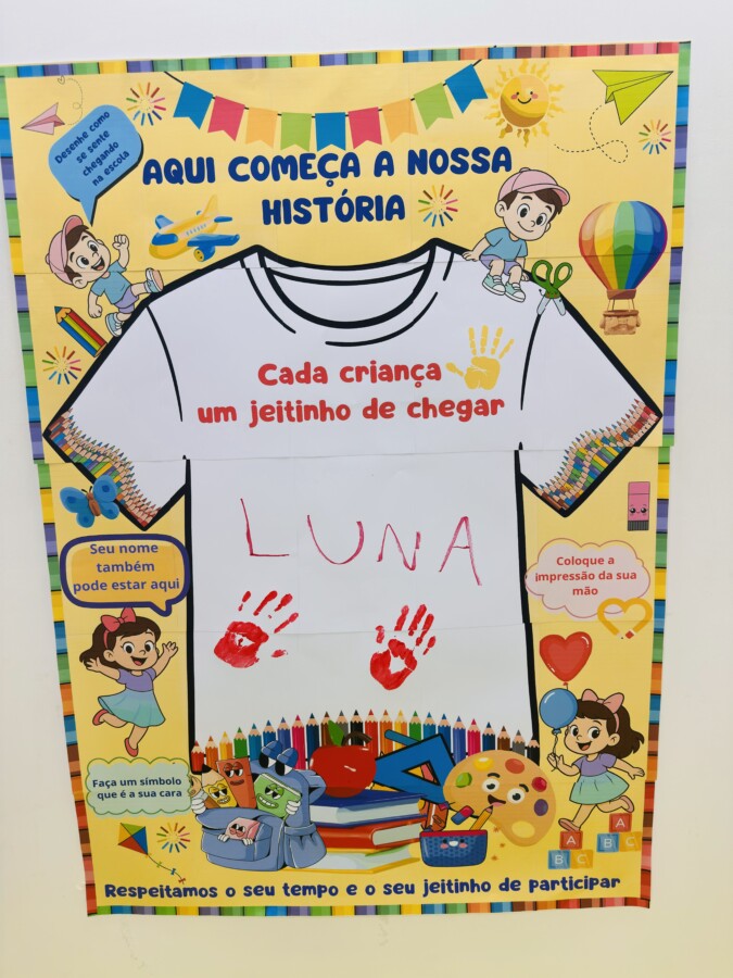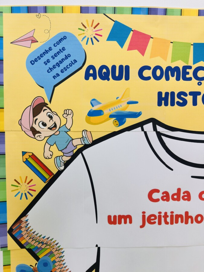 O grande destaque é a camisa central, que se transforma em um mural coletivo, construído aos poucos, conforme as crianças chegam, interagem e se sentem seguras no novo ambiente escolar.
