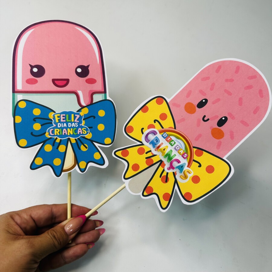 São palitinhos decorativos em formato de picolés divertidos, todos com carinhas expressivas e simpåticas, transmitindo alegria e fofura. Cada picolé possui um laço grande e colorido estampado com a frase: