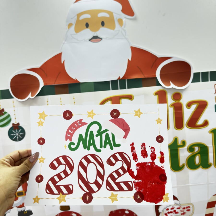 Cada aluno também recebe uma atividade individual, onde repete o mesmo número com tinta guache ou carimbo, registrando sua mãozinha natalina como lembrança afetiva do ano letivo.