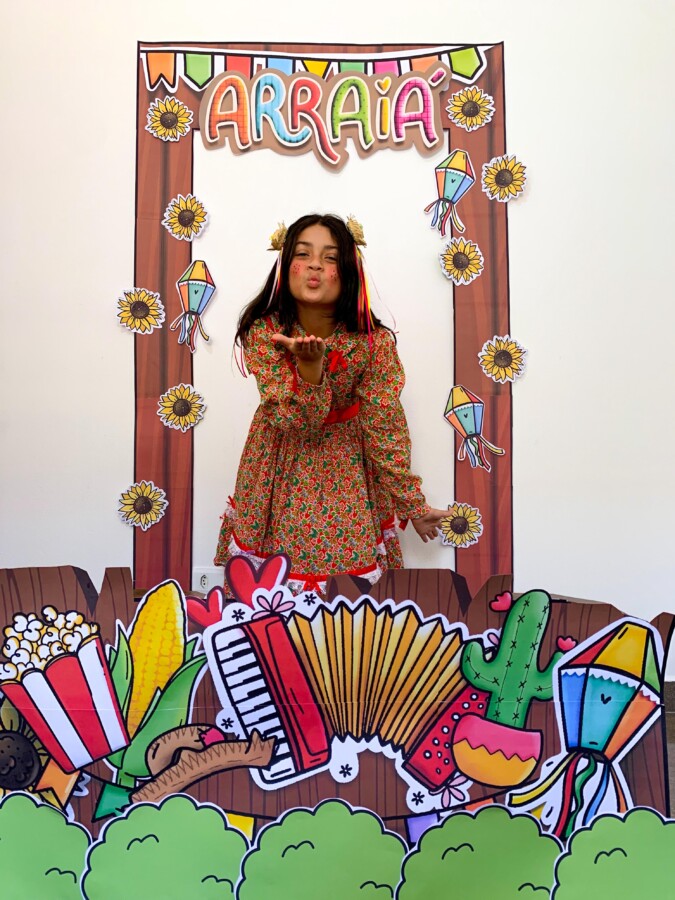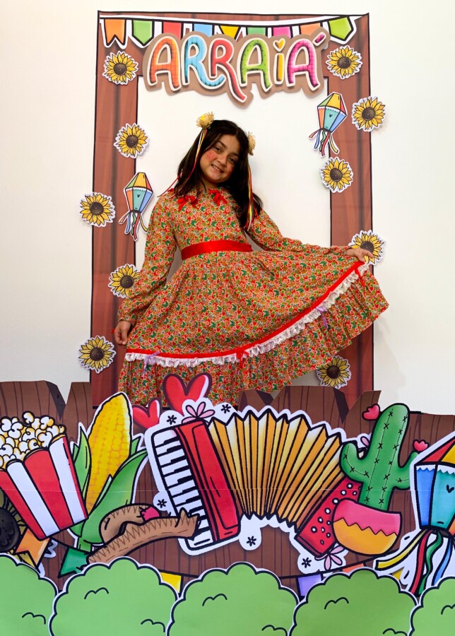 🎭 Elementos típicos: flores, chapéus de palha ( você pode acrescentar), sanfona fake, saco de pipoca, espiga de milho