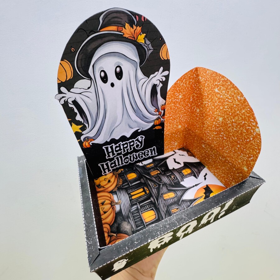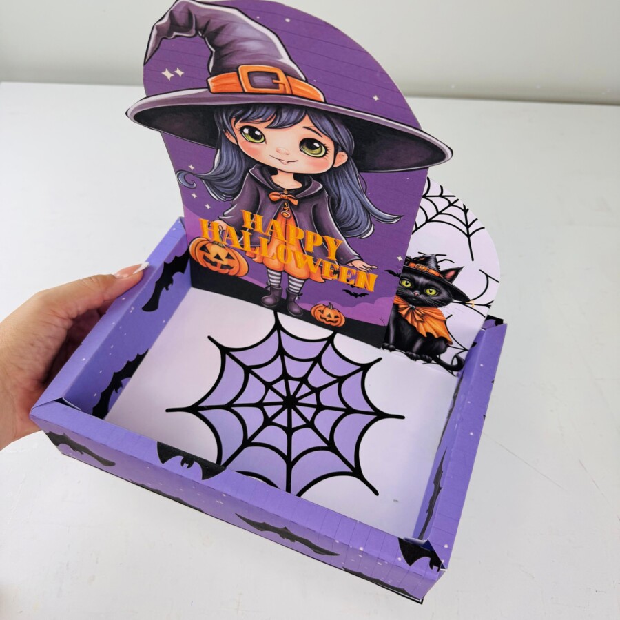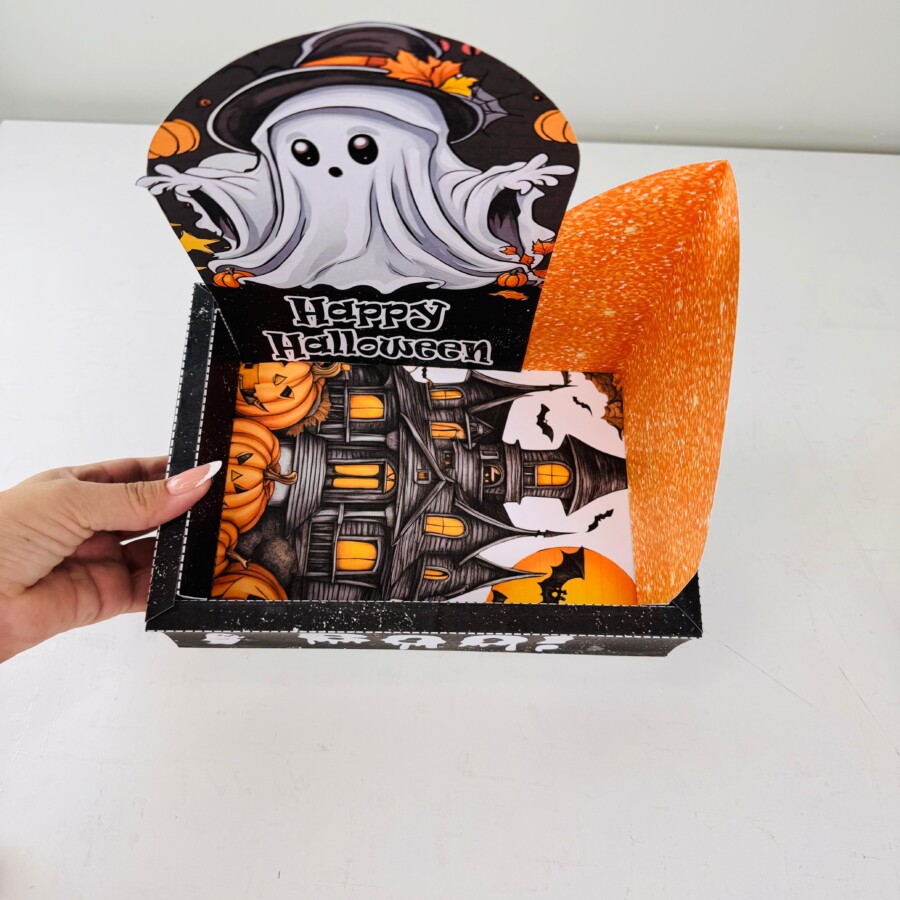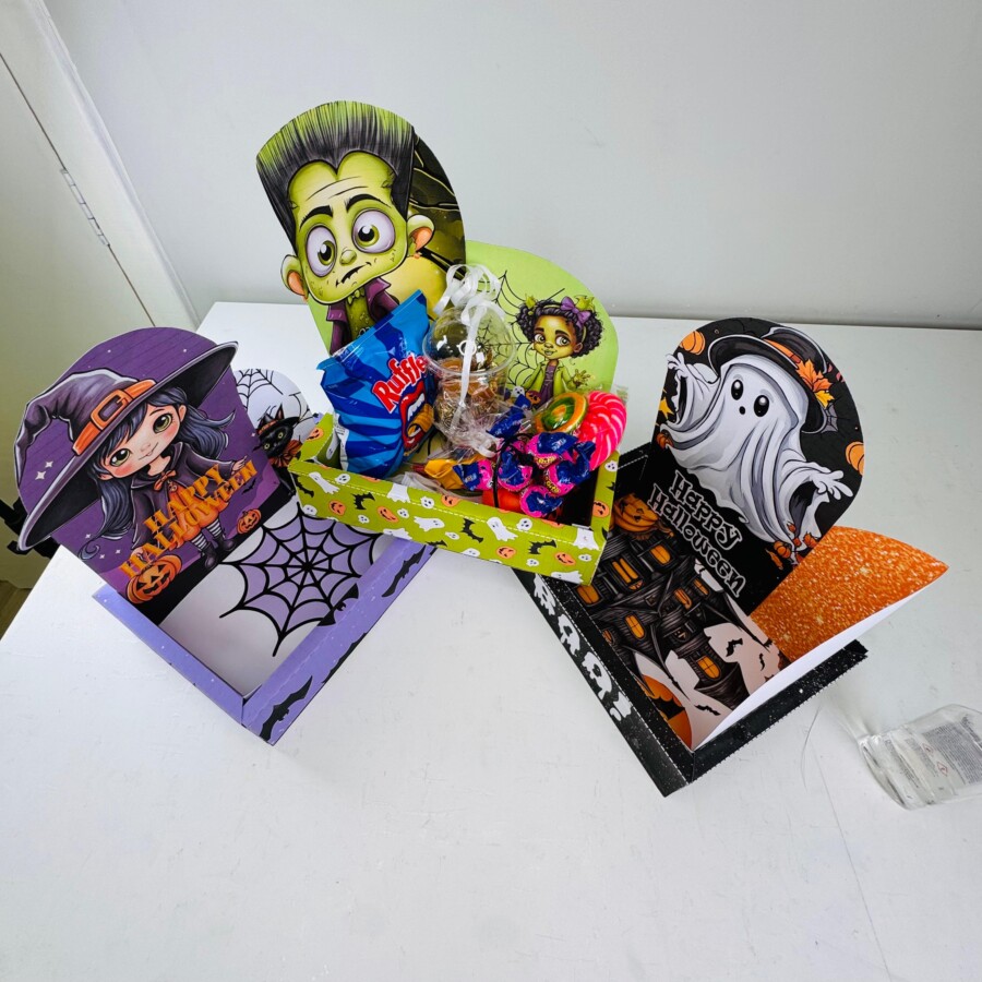 Cada caixa é rica em detalhes e texturas, com interior estampado, laterais temáticas e verso ilustrado, transformando o presente ou decoração em uma mini cena de Halloween.