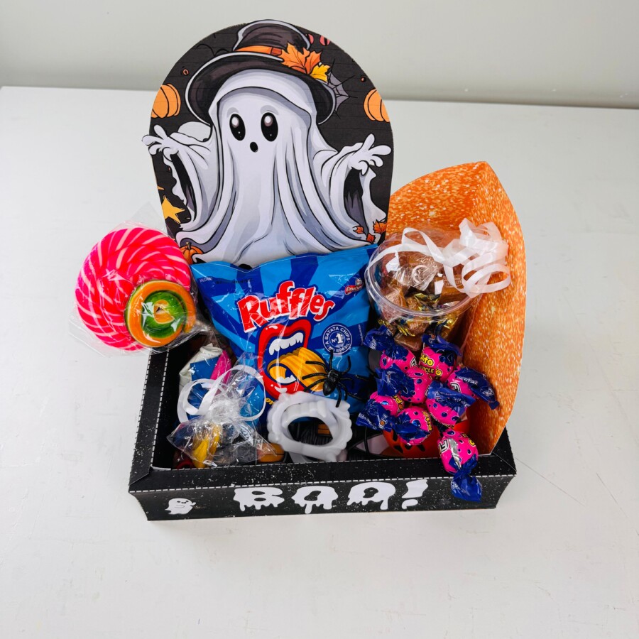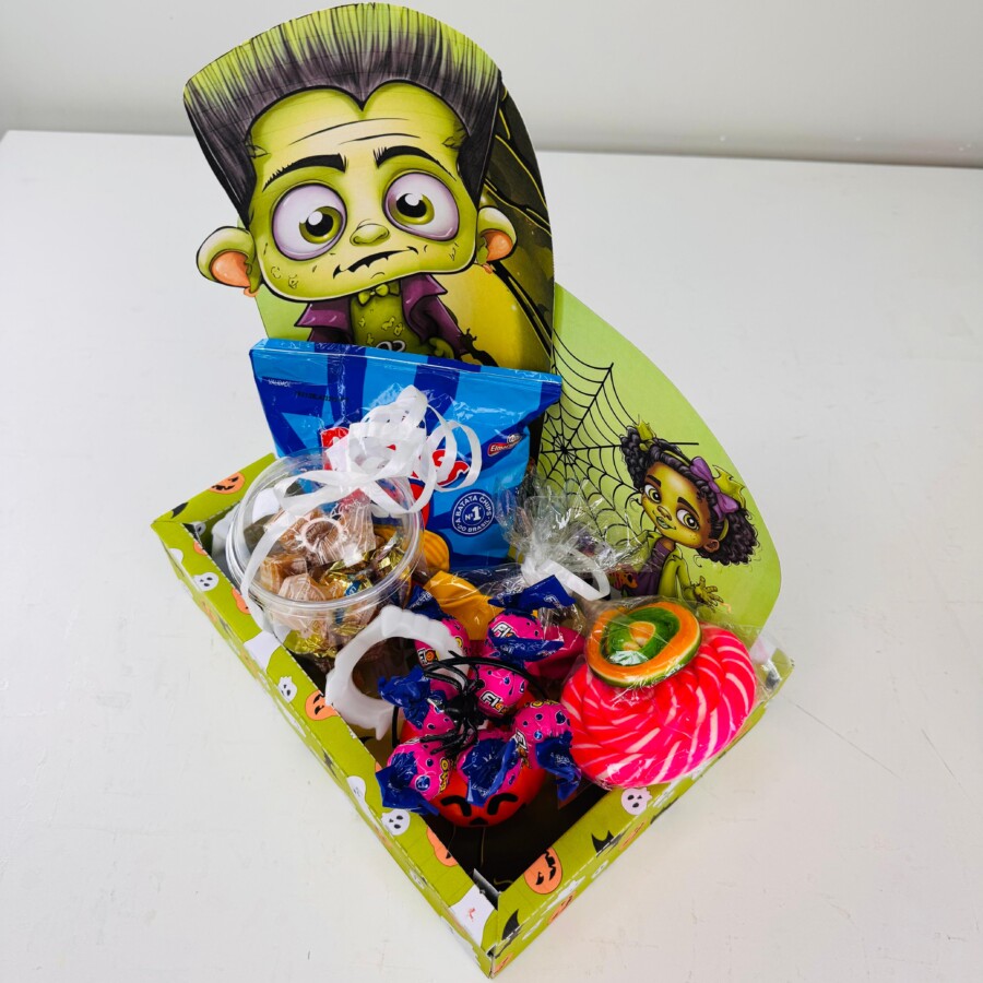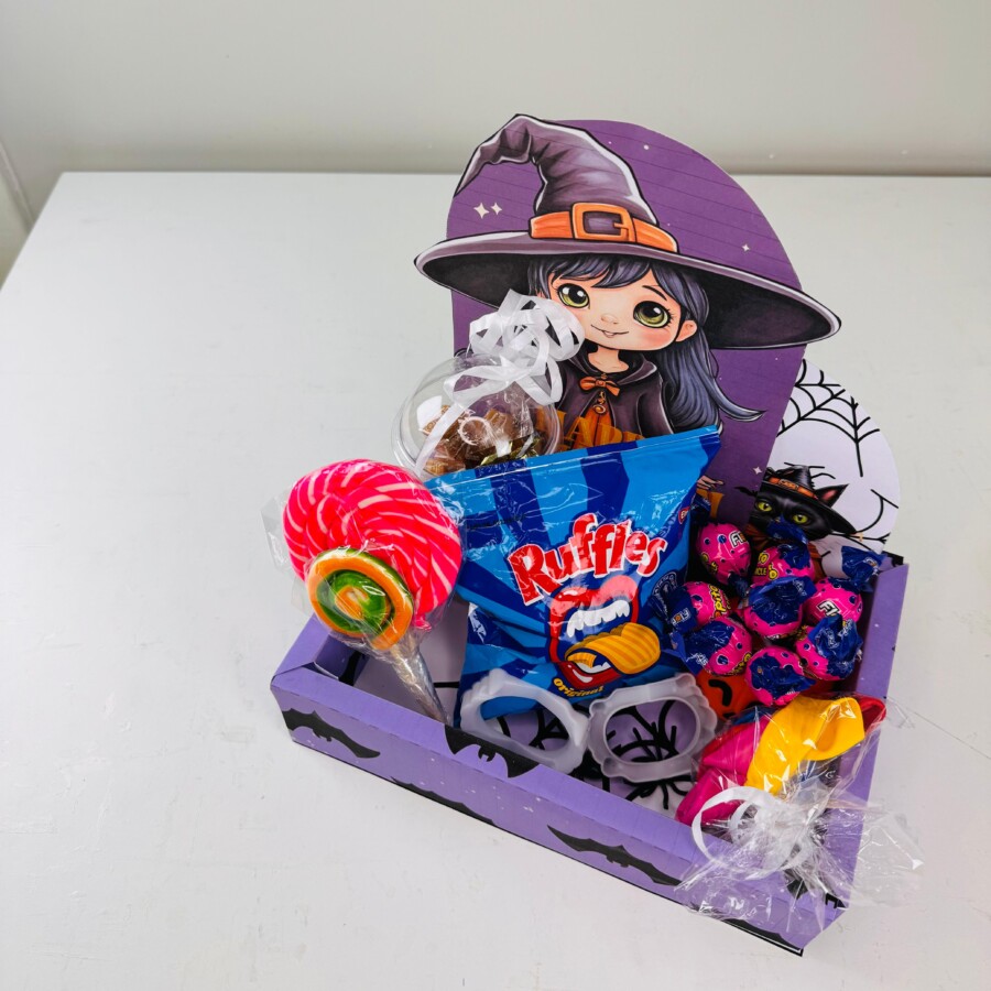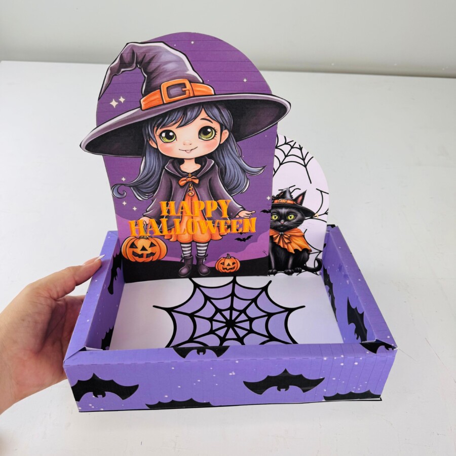 Cada caixa é rica em detalhes e texturas, com interior estampado, laterais temáticas e verso ilustrado, transformando o presente ou decoração em uma mini cena de Halloween.