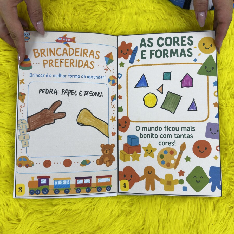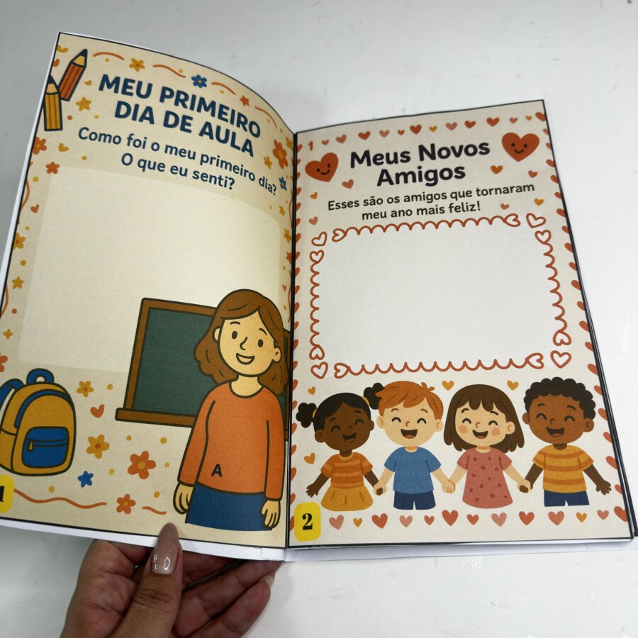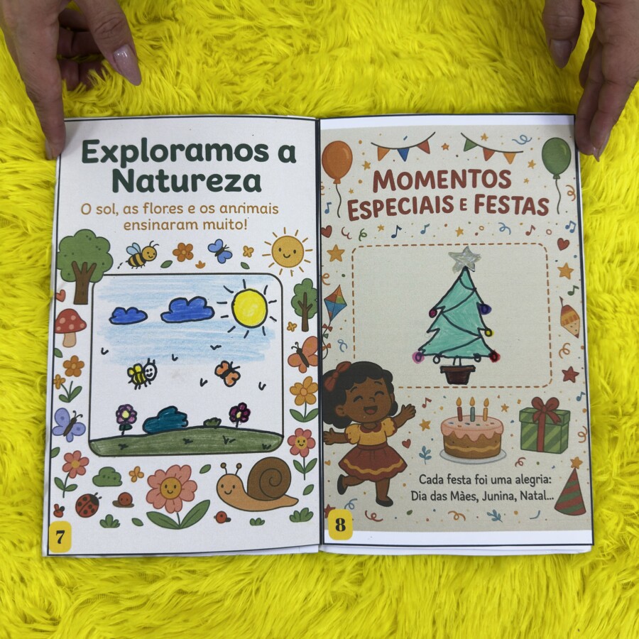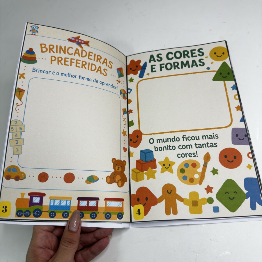Cada página foi pensada com linguagem simples, ilustrações alegres e espaços interativos, onde os pequenos podem desenhar, colorir, colar fotos e registrar experiências marcantes.