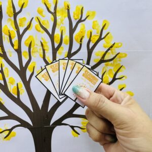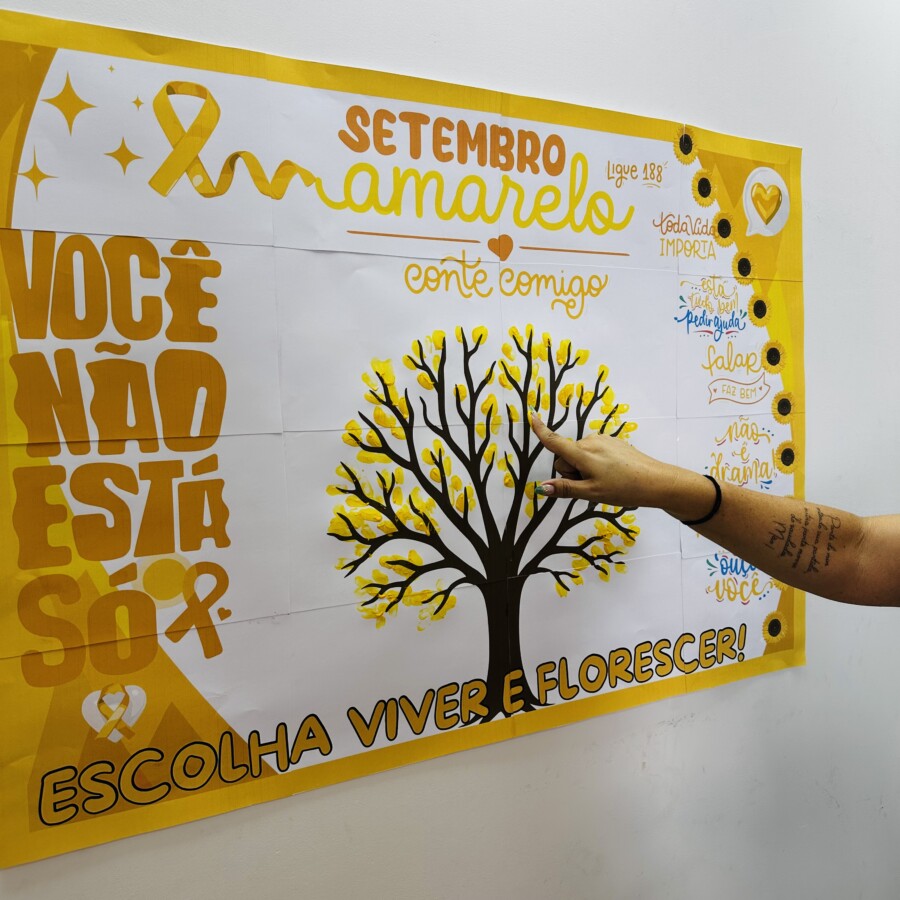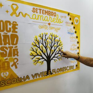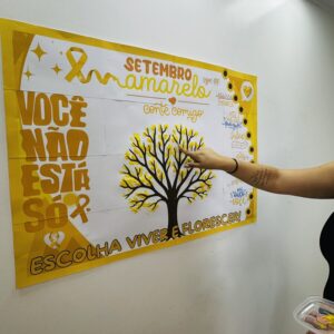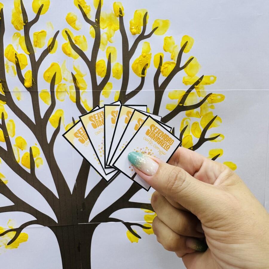No centro, uma árvore simboliza a vida e a esperança, que vai ganhando cor e significado de forma interativa: as crianças marcam seus dedinhos com tinta amarela, deixando suas impressões nas folhas da árvore. 🌳✨