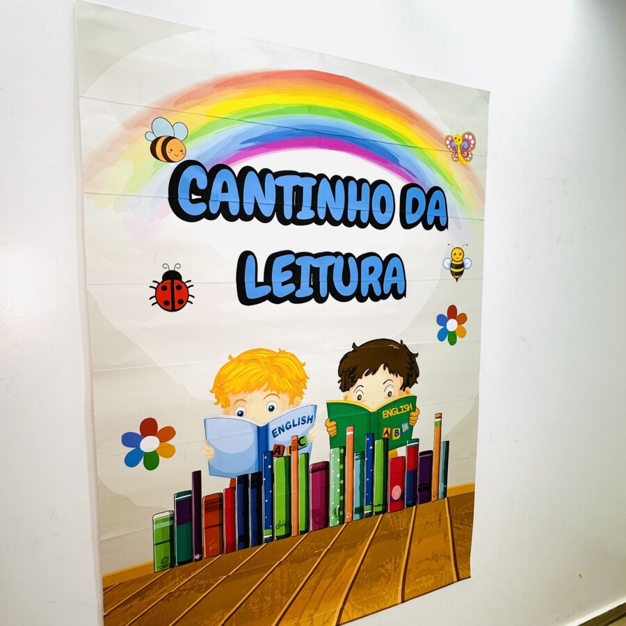 Composto por ilustrações de crianças lendo, arco-íris e elementos lúdicos como flores, abelhas e borboletas, ele cria um ambiente acolhedor e encantador para despertar o gosto pelos livros.