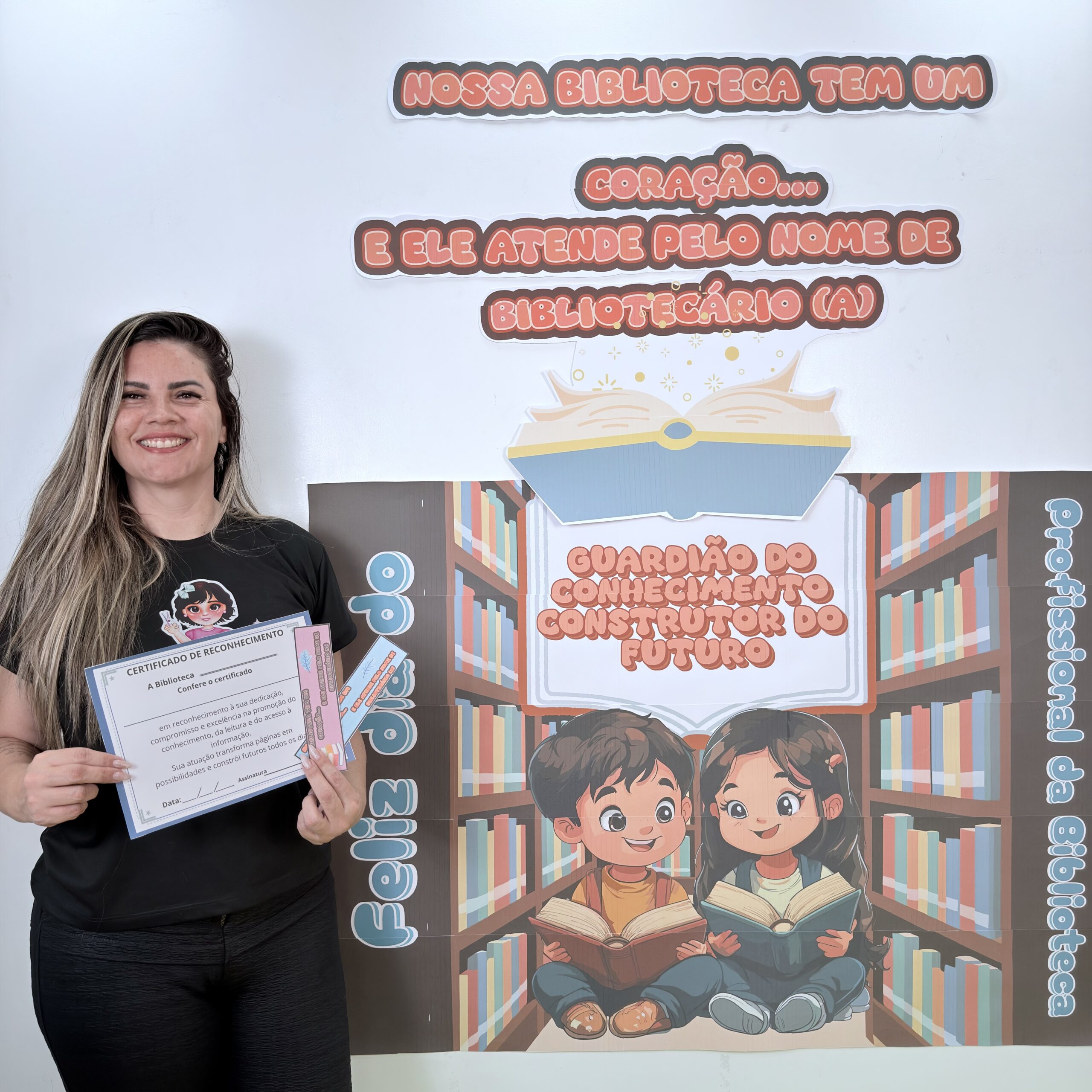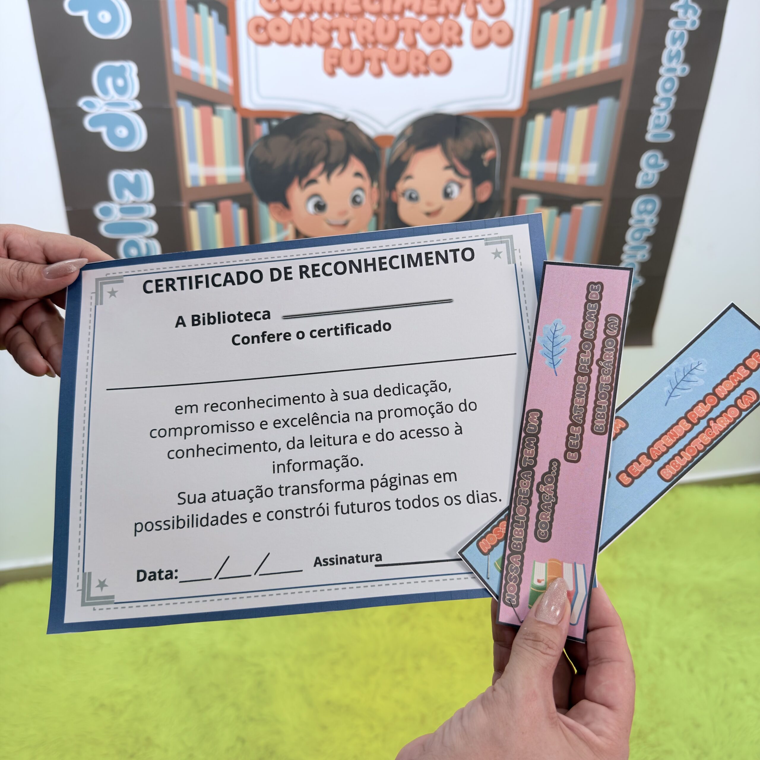 O material também inclui um certificado simbólico, ideal para homenagear o bibliotecário ou bibliotecária da instituição.