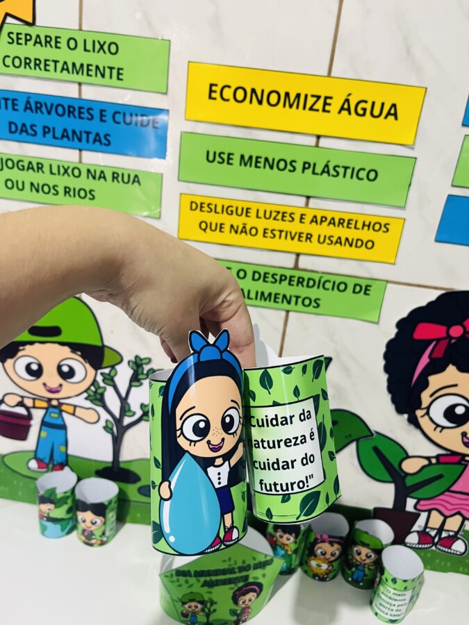 ✅ Rolinhos interativos do Meio Ambiente, cada um com uma frase educativa para as