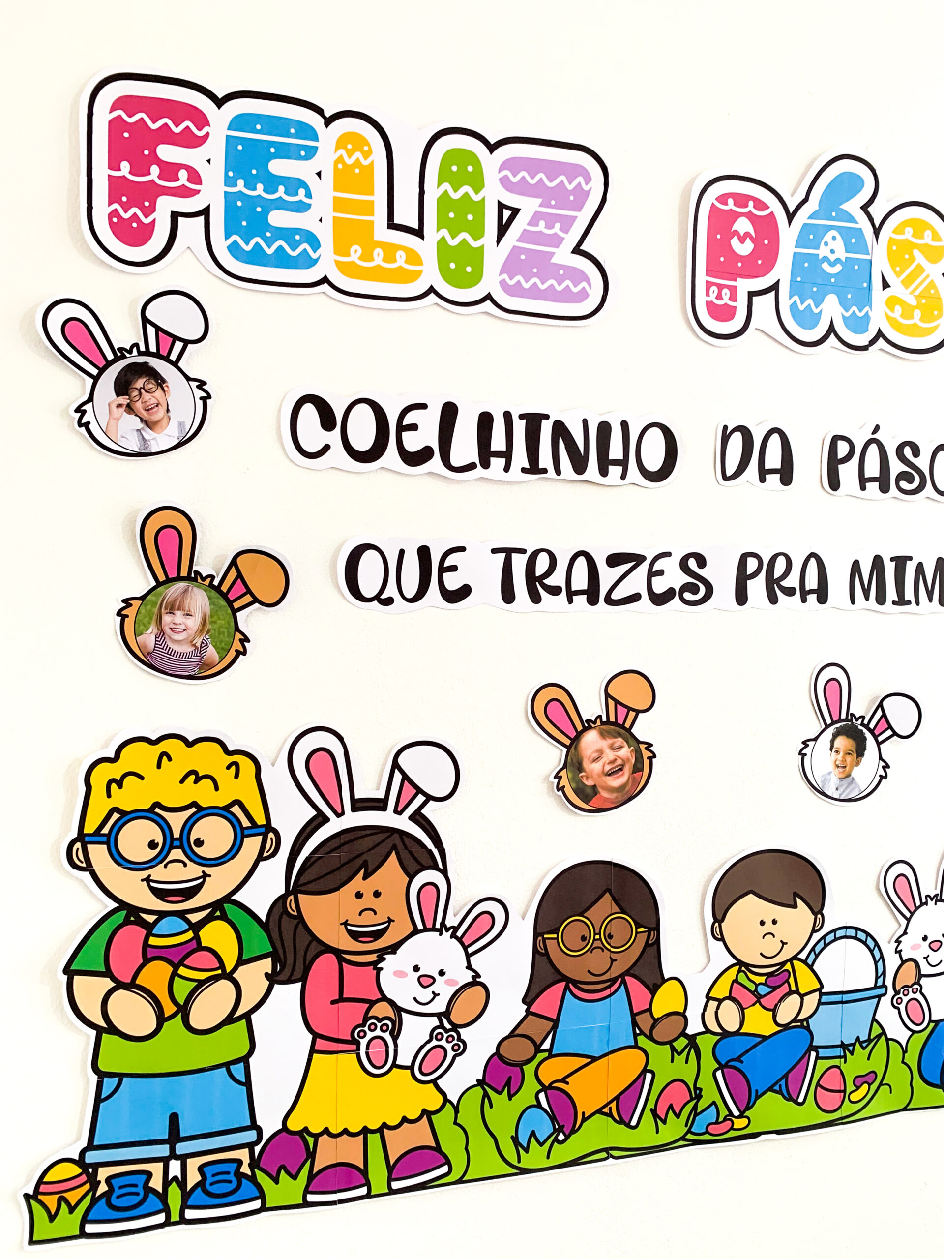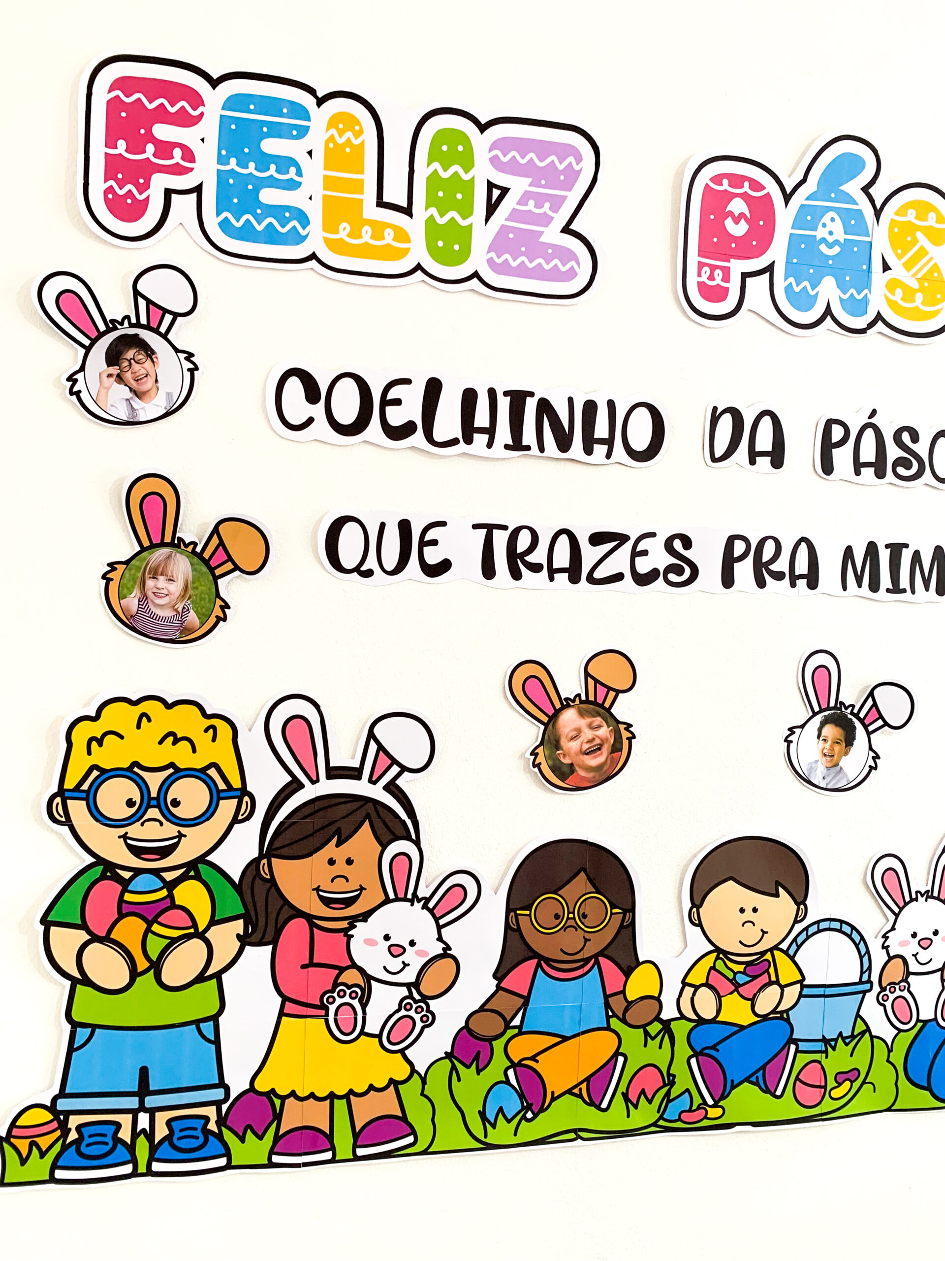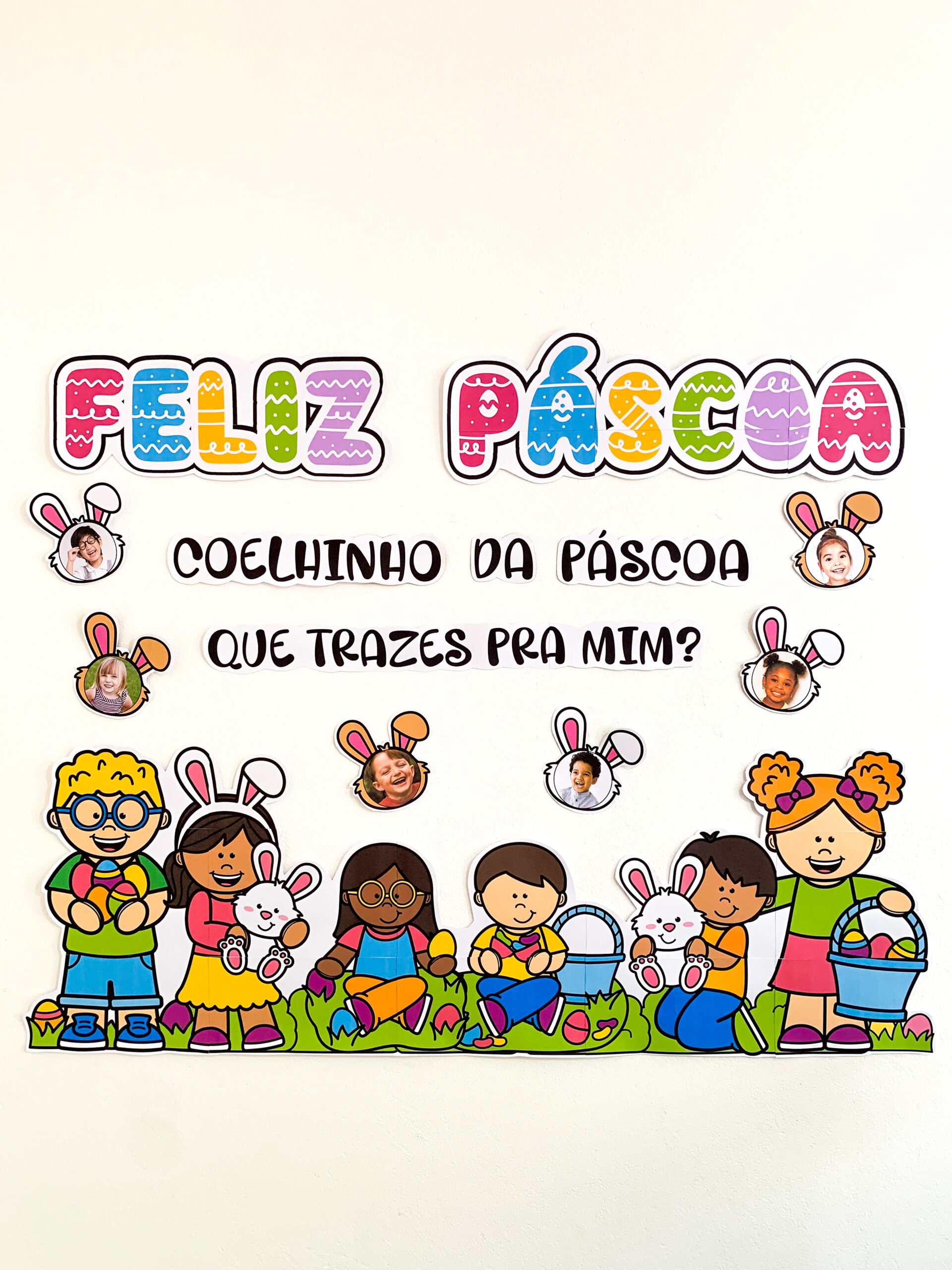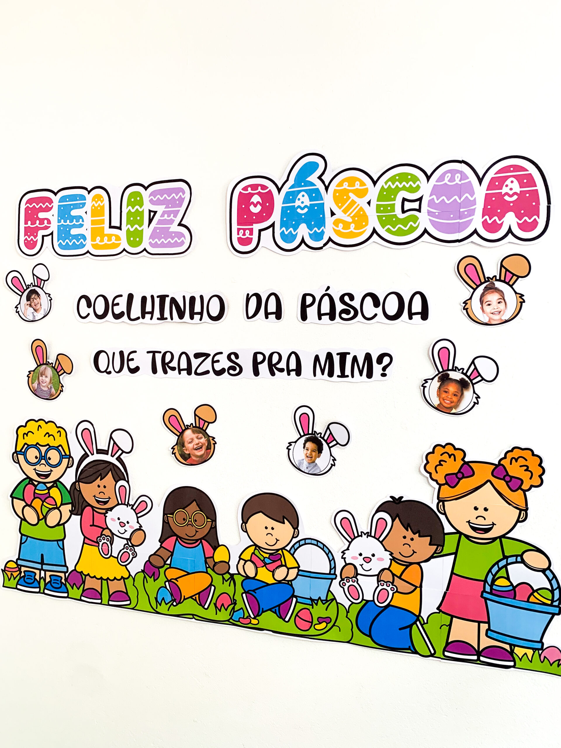 A frase principal “Feliz Páscoa!” brilha no painel,